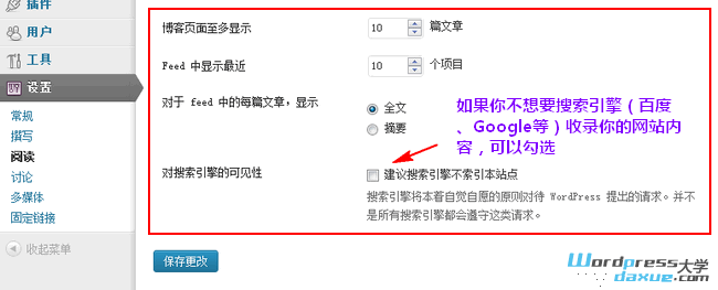 可以简单设置下页面显示文章的篇数(不同的主题设置可能不能),还可以设置是否让搜索引擎收录。