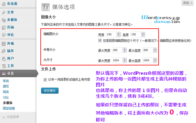 当然,这里是全局设置,如果有些主题自己在 functions.php 通过函数定义了生成图像缩略图,而且主题中需要调用,还是会生成主题所定义的缩略图的。也就是说,主题自定义高于WordPress默认设置。但不管怎么说,默认设置改为 0 是不会错的,当然如果主题作者要求你在这里设置其他的数值的除外。