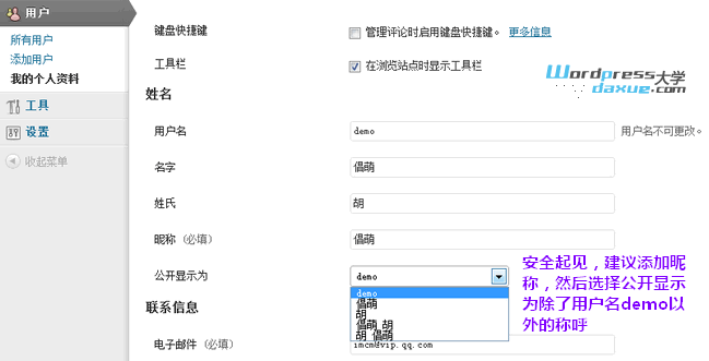需要注意的是,建议填写一下昵称,然后设置【公开显示为】选择除了 登录的用户名 以外的其他名称,这里的内容会在网站的前台显示,如果你直接使用 登录的用户名,存在安全隐患。
